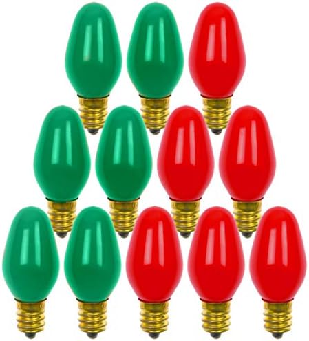 About this item Pack of 12 Candelabra Base, C7 Ceramic Red Night Light Bulbs Green Night Light Bulbs c7 christmas light bulbs. Ideal for chandeliers, wall lights,Halloween and Christmas Strings, decorative fixtures, night lights and any accent lamp with a candelabra size socket. 2000 Hours Average Lamp Life on this c7 christmas lights outdoor